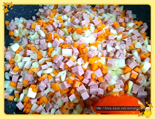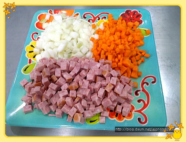 양파와 당근 그리고 햄을 썰어 보았습니다.