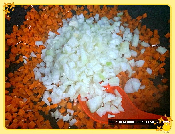 당근을 먼저 볶기 시작했고, 양파를 넣어서 볶았습니다.