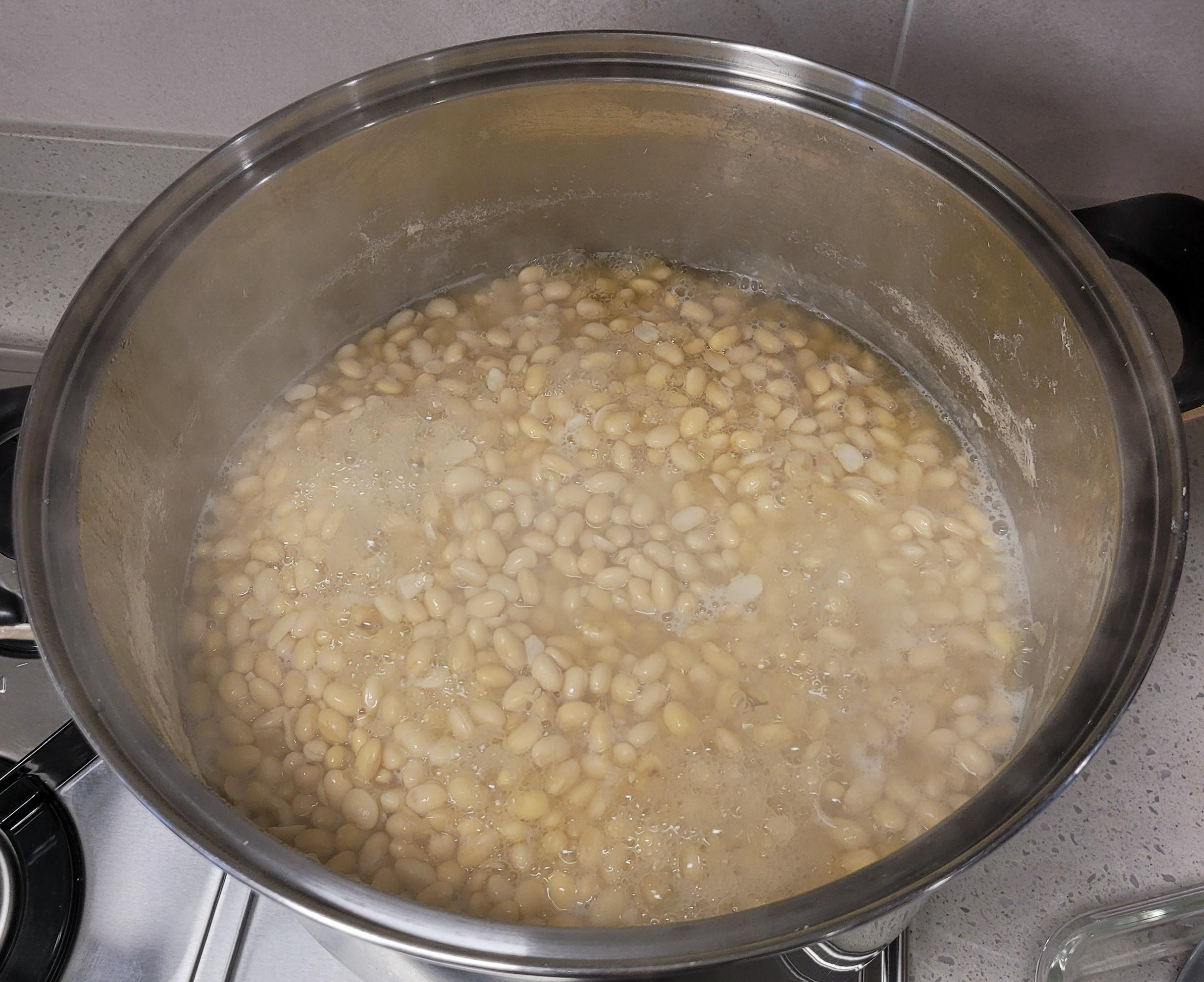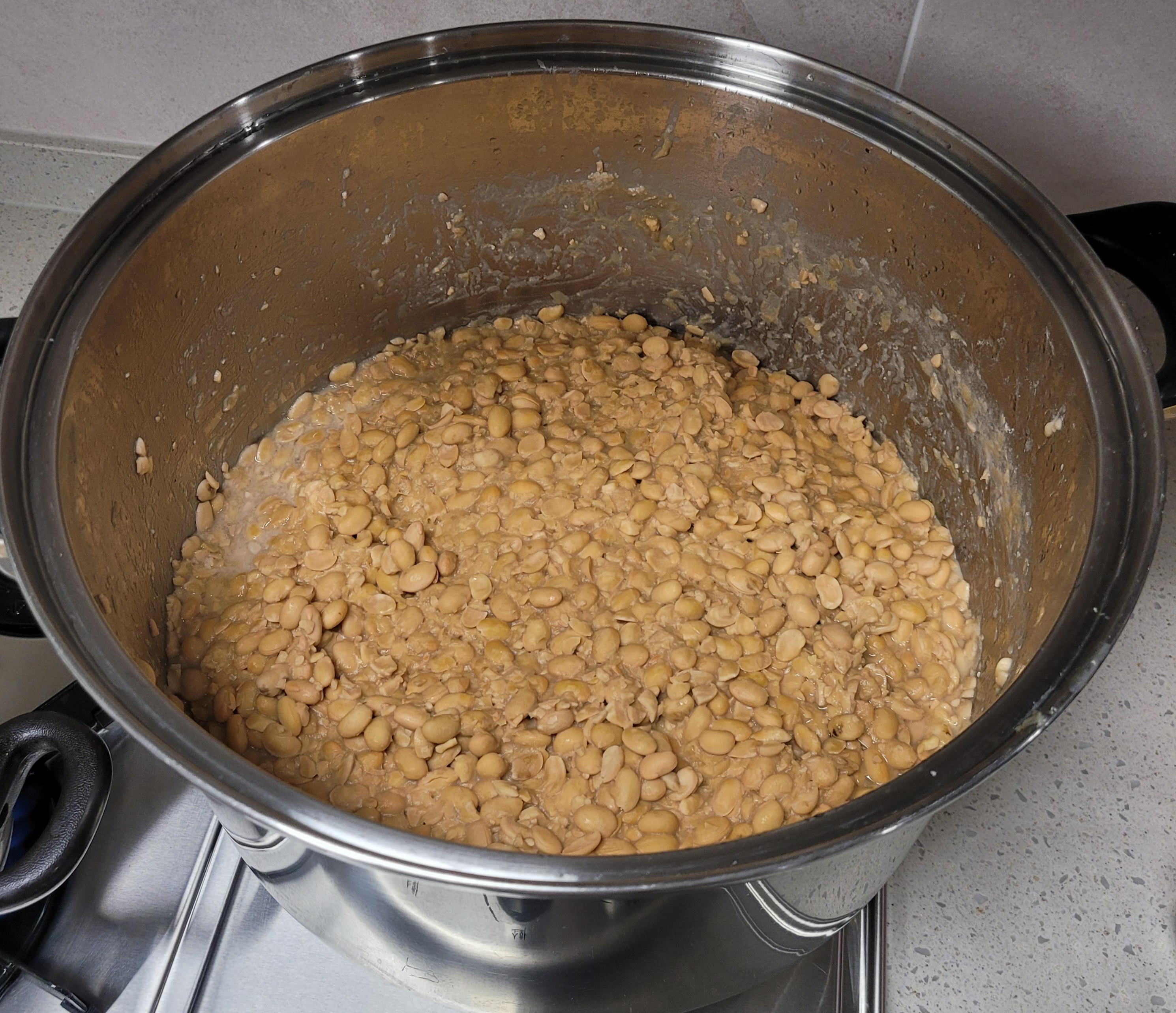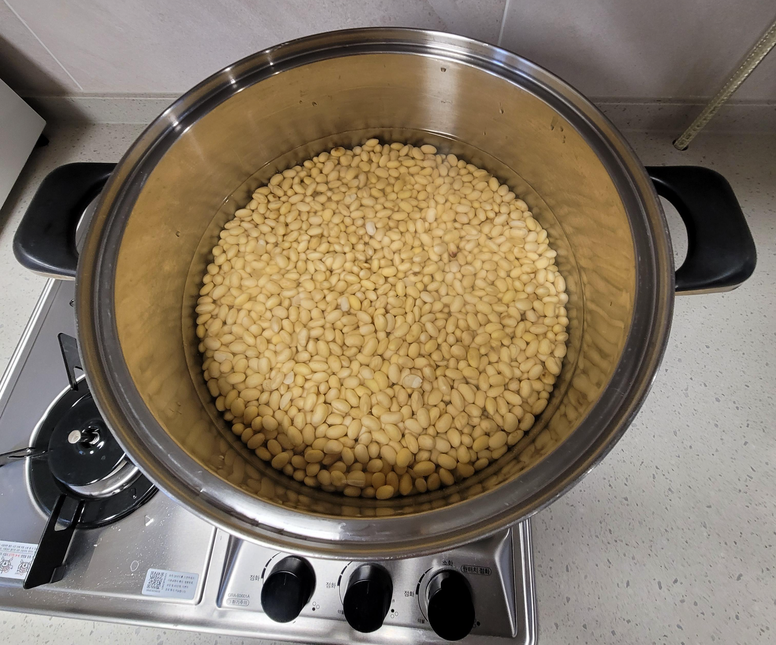 4. 6시간 불린 콩을 대형솥에 넣어서 삶기 시작했어요.