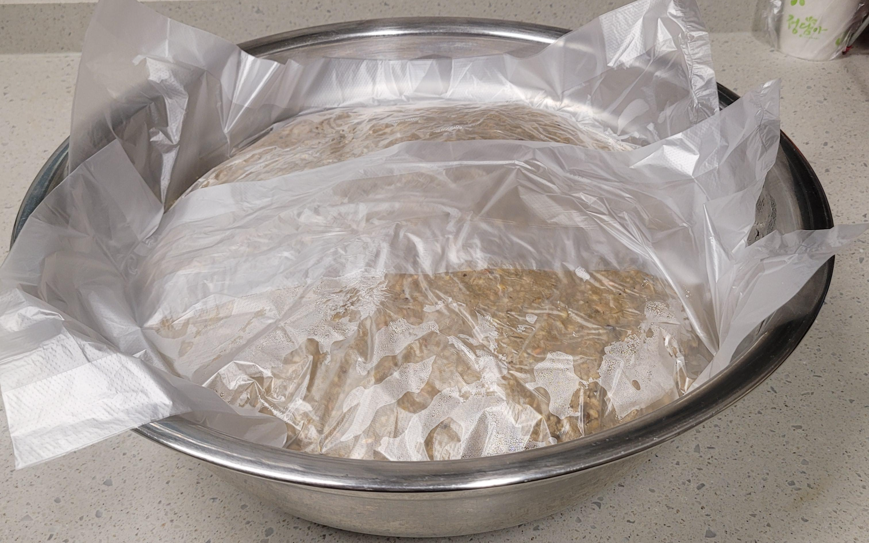 3. 6시간 이상 불린 콩을 찜통에 넣고 물을 콩이 잠길 정도로 부어요.(콩 2kg에 물 4리터)